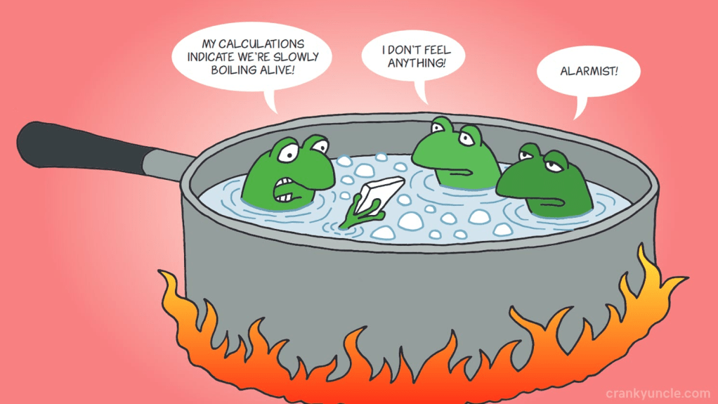 Do you know that saying, or maybe it’s a fable, about the frog in the boiling water? How if you try to put a frog into boiling water, it will jump out? But if you put a frog in cool water and gradually turn up the temperature, it will remain in the water and boil alive?
