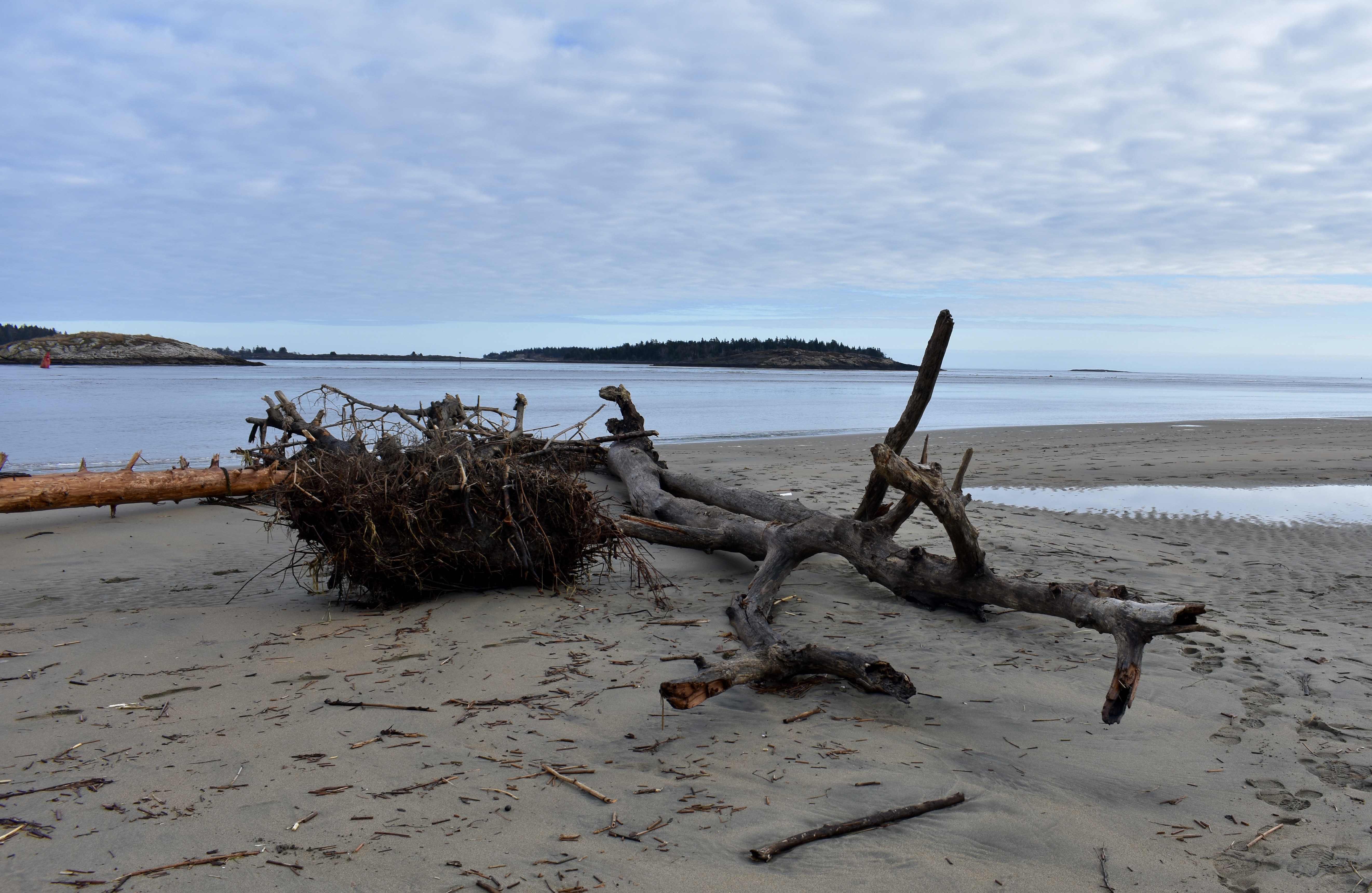 We arrived to find only a few cars in the parking lot. Nick and Lydia headed off to explore the fort, and Kurt and I wandered on the path toward the beach. Already we saw mounds of debris and driftwood along the path’s edges. We came upon a white-haired man sitting on a bench overlooking the water.