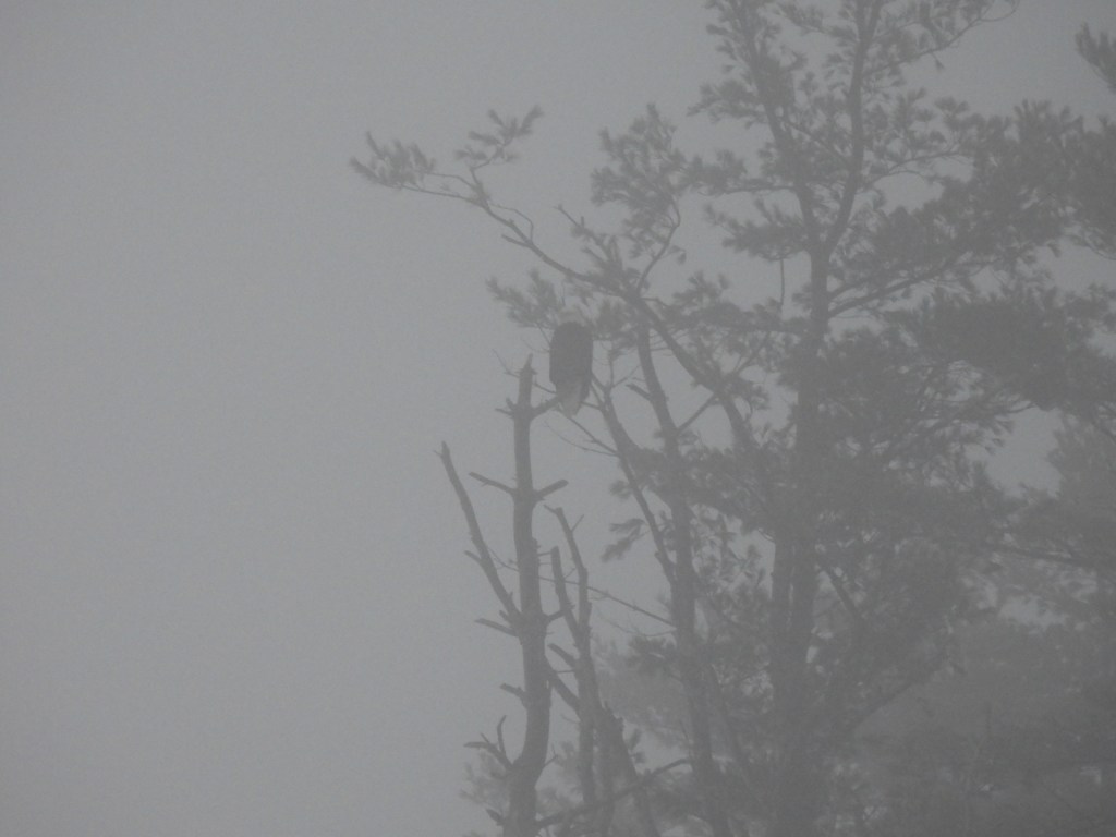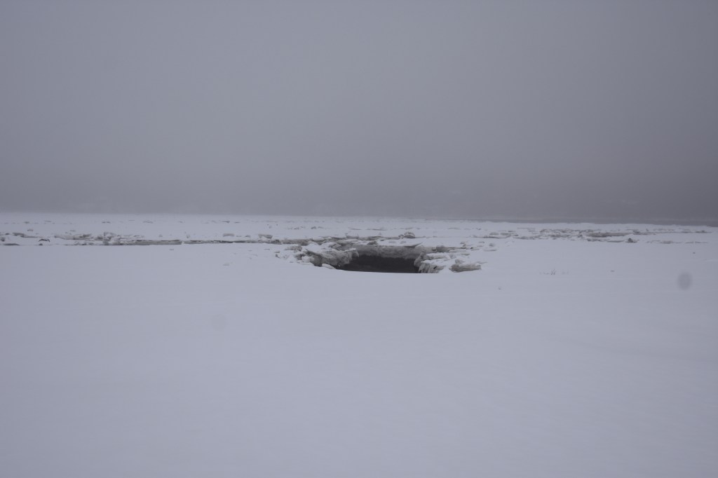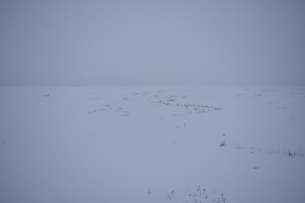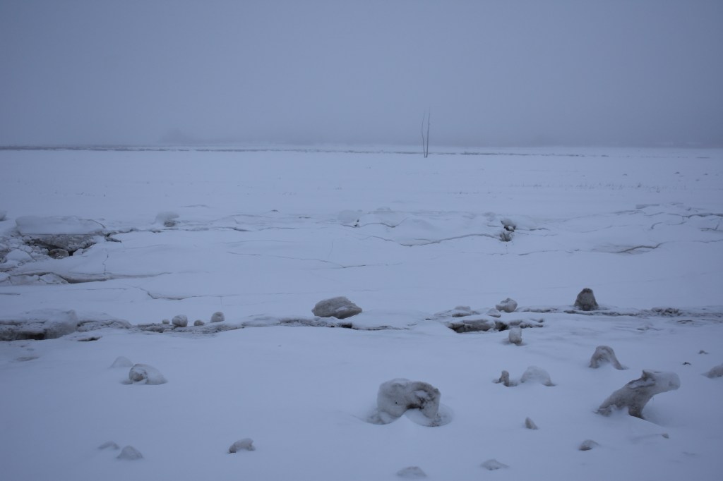 I pull into the empty parking lot, park my car, and grab my camera. Walking over to the path, I gaze out over the marsh. I see a small movement and turn to look. My arrival has disturbed two ducks. They paddle further away, slip streams rippling out behind them. I watch them for a bit then turn my attention to a tall tree across the channel. Often there is an eagle there, or later in the year, an osprey. I see a very faint outline. Is that an eagle? I zoom in with my camera, and only then can I confirm that it is. Even though I can barely see it, I like knowing it’s there, across the snowy expanse, where marsh grasses also lie hidden, dormant beneath thick layers of snow and tumbled chunks of ice. On the other side of the water. A silent companion in the mist.