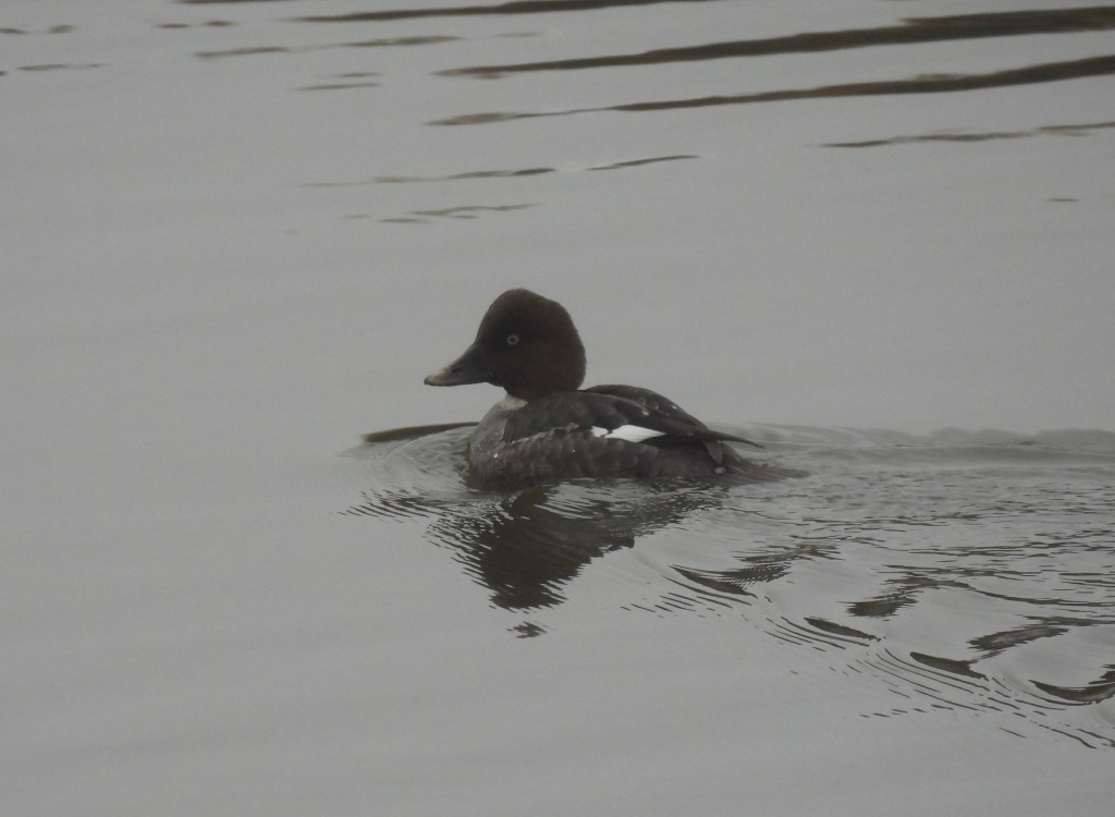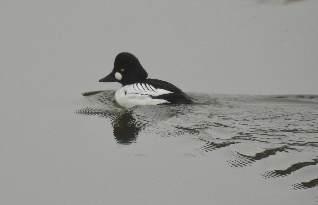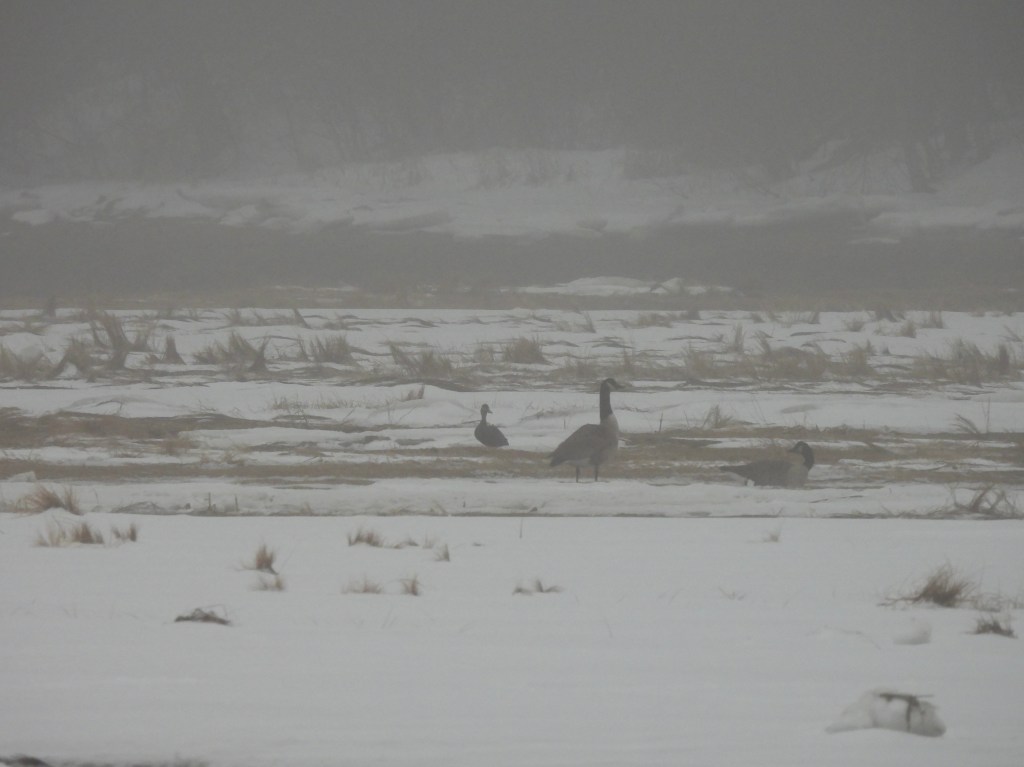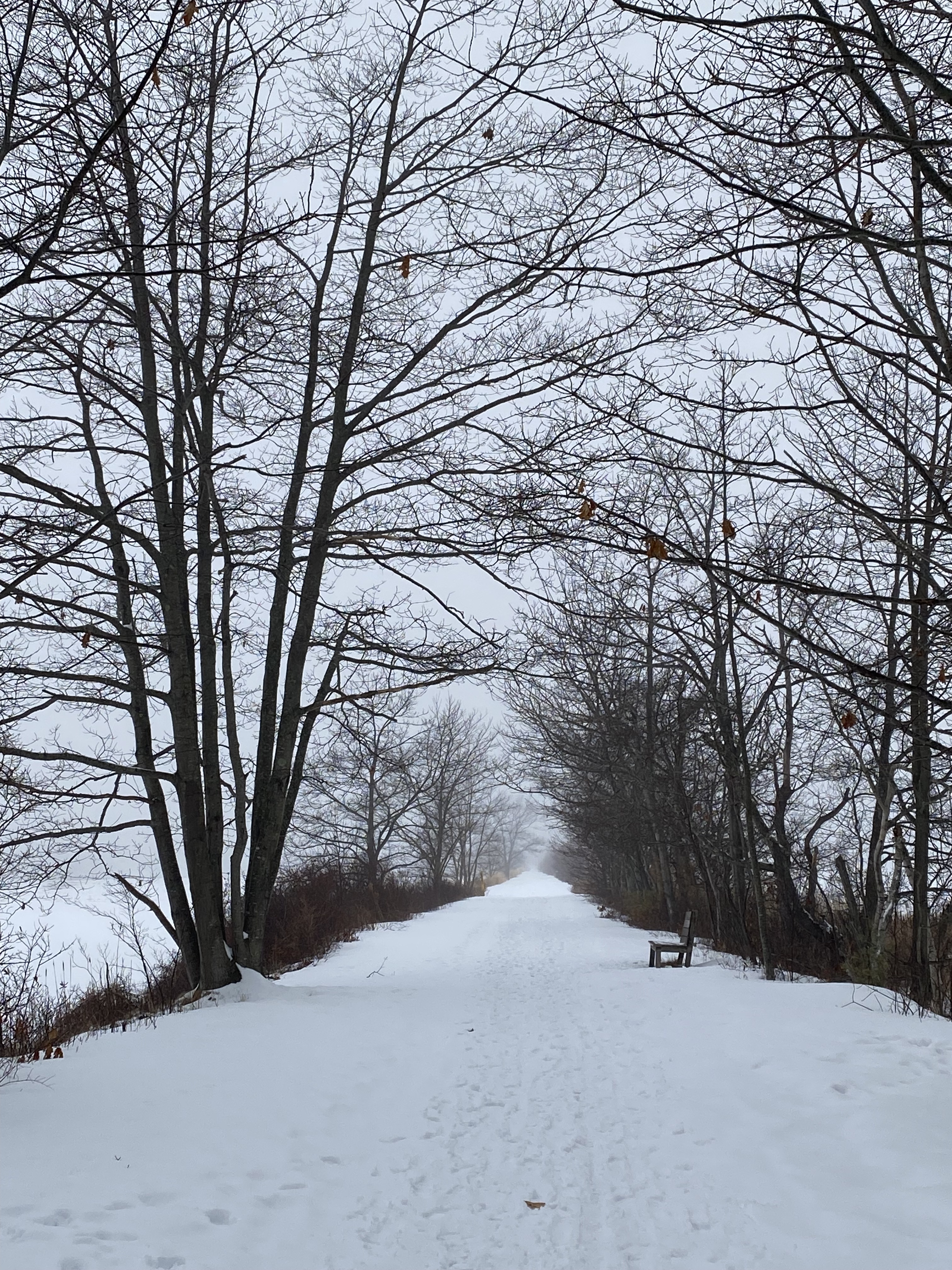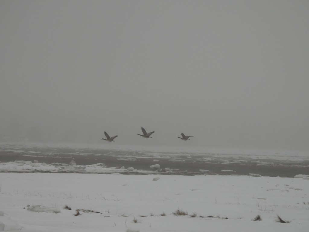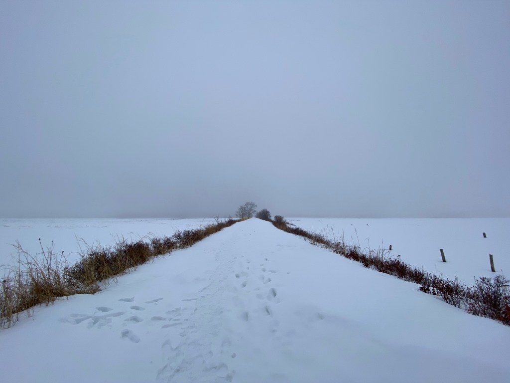 With every step further onto the trail, with every sweep of my eyes over the hazy horizon, it’s as if I’m unspooling even further. Loosening. Every so often I hear a crow call. Or a seagull. I see Canada geese and watch them fly low across the snowy expanse. See their silhouettes hazy in the mist across the water. Admire a few ducks as they slip in and out of view.