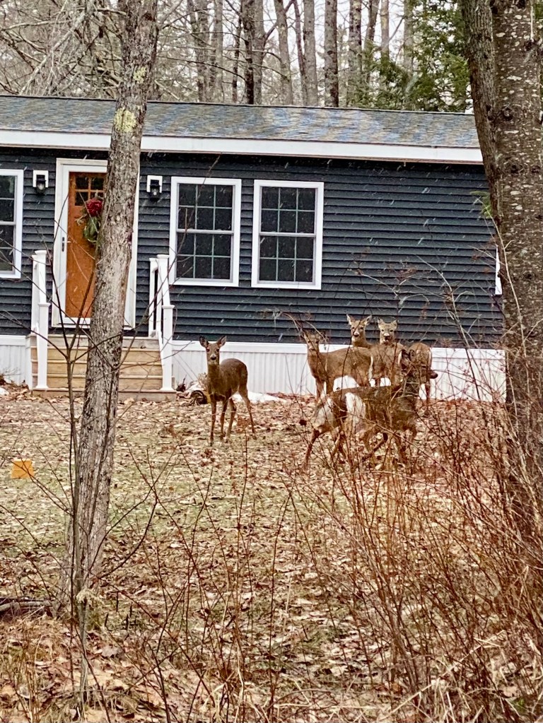 Then, I’m not sure if I hear something or see something, but some sense makes me turn away from the open fields on the left and toward a house on the right side of the street. There, standing together and watching me are five deer. I stop abruptly.