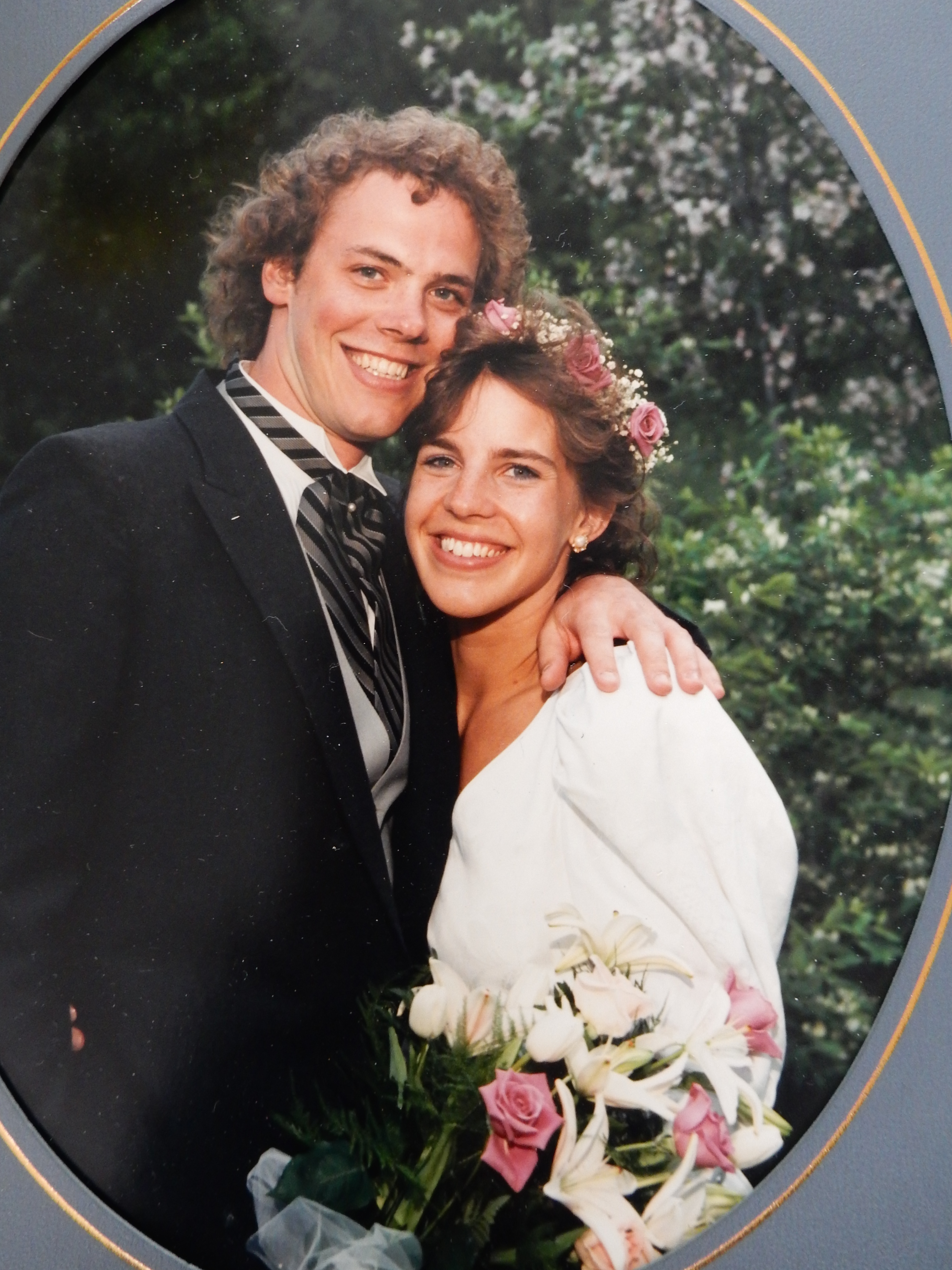 The florist overheard me and picked up the rose.  She twirled it slowly in her hand, smelled it, then handed it to me and Lydia, inviting us to do the same.  When it was my turn, I inhaled deeply, trying to recapture that afternoon so long ago.  I remember my wedding roses as richly perfumed, but this one had a more delicate aroma, subtle but lovely.  I inhaled deeply again, then handed the rose back to the florist.