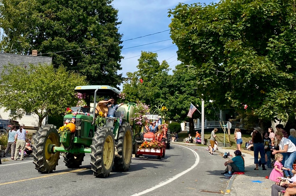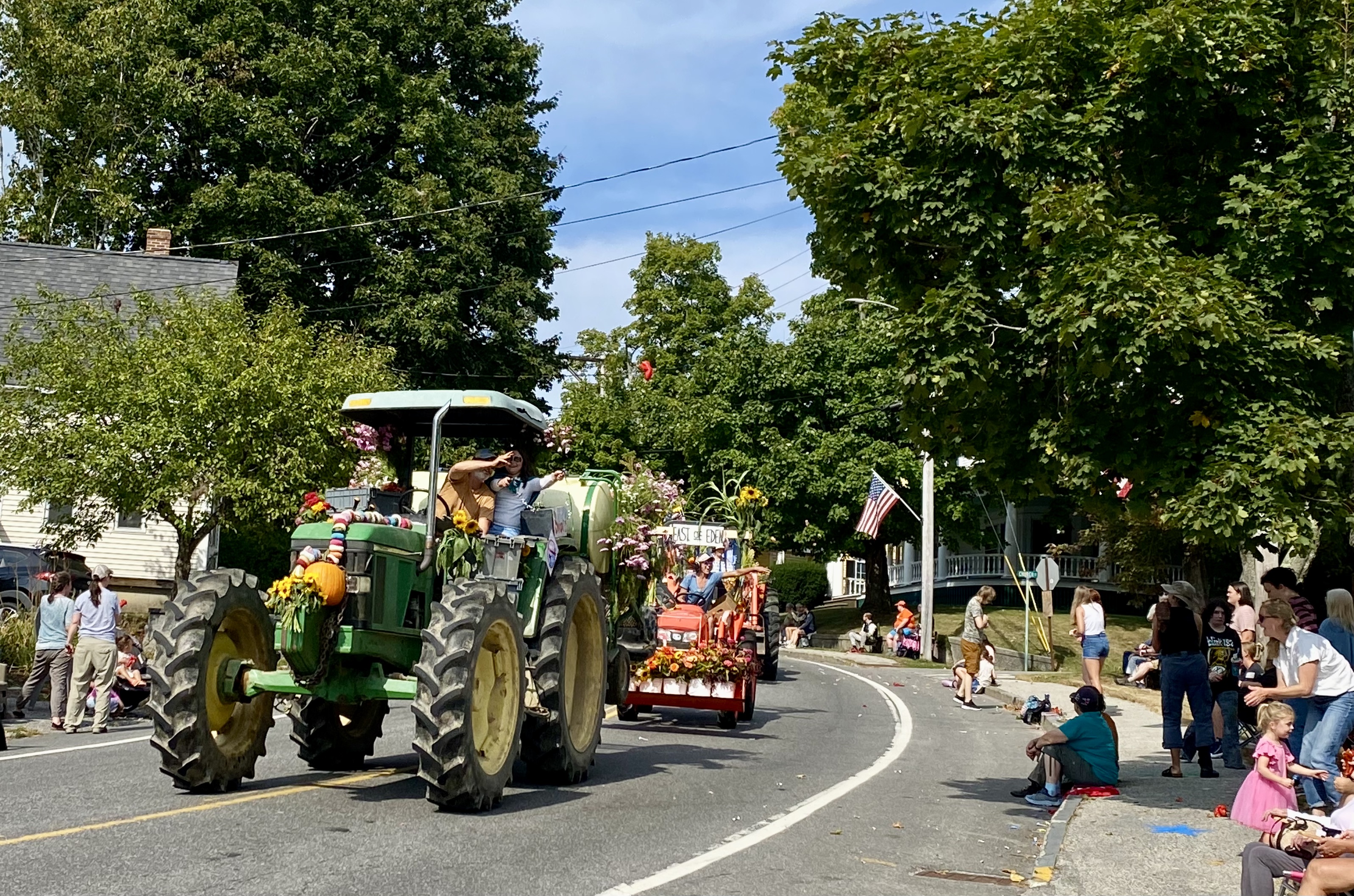 Finally, there was a whoop and wail from the escorting police cars, and the parade began. This parade is my favorite thing ever! It’s simply the best. Our town of slightly over 3,000 people has deep agrarian roots and a rich network of active farms. As the tractors trundled down the parade route, they threw some candy, but lots and lots of veggies. This year the choice options were red peppers, carrots and, maybe not so wisely, cherry tomatoes. They also throw marigolds and soon the route was paved with orange petals and flower heads. This year the library stepped up their game and handed out picture books to children. One local farm deviated from the veggie plan and handed out huge glowing sunflowers to spectators. (If you look carefully in the tractor pictures you’ll see flying tomatoes and red peppers!)
