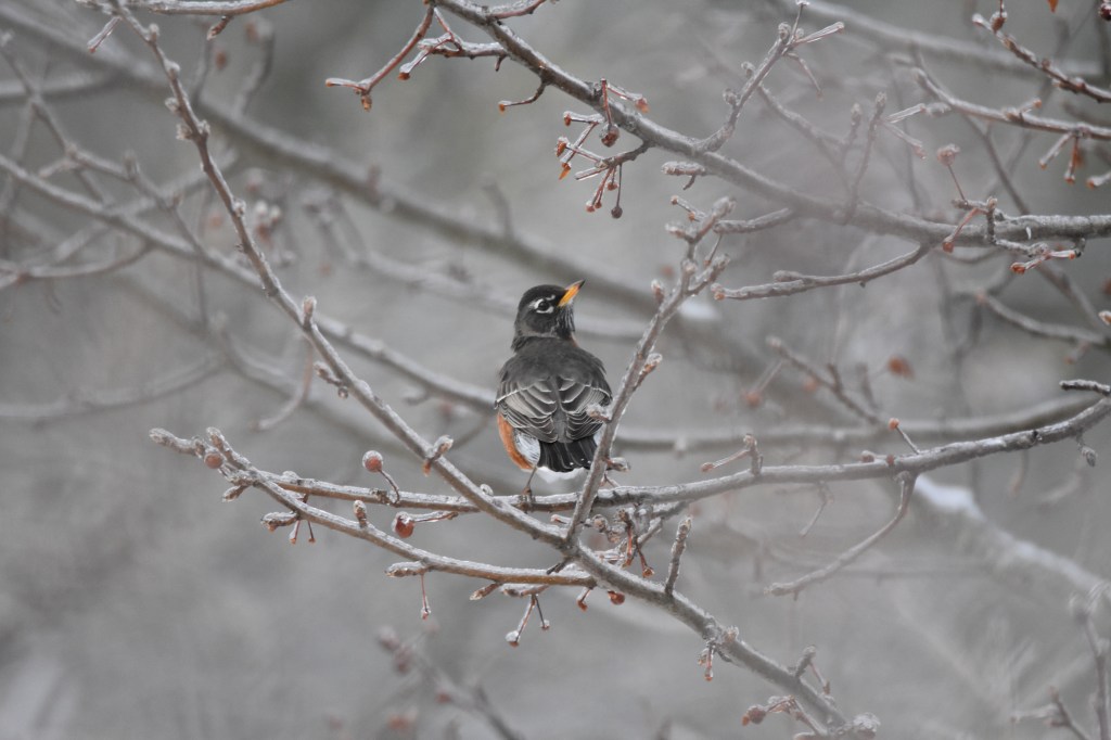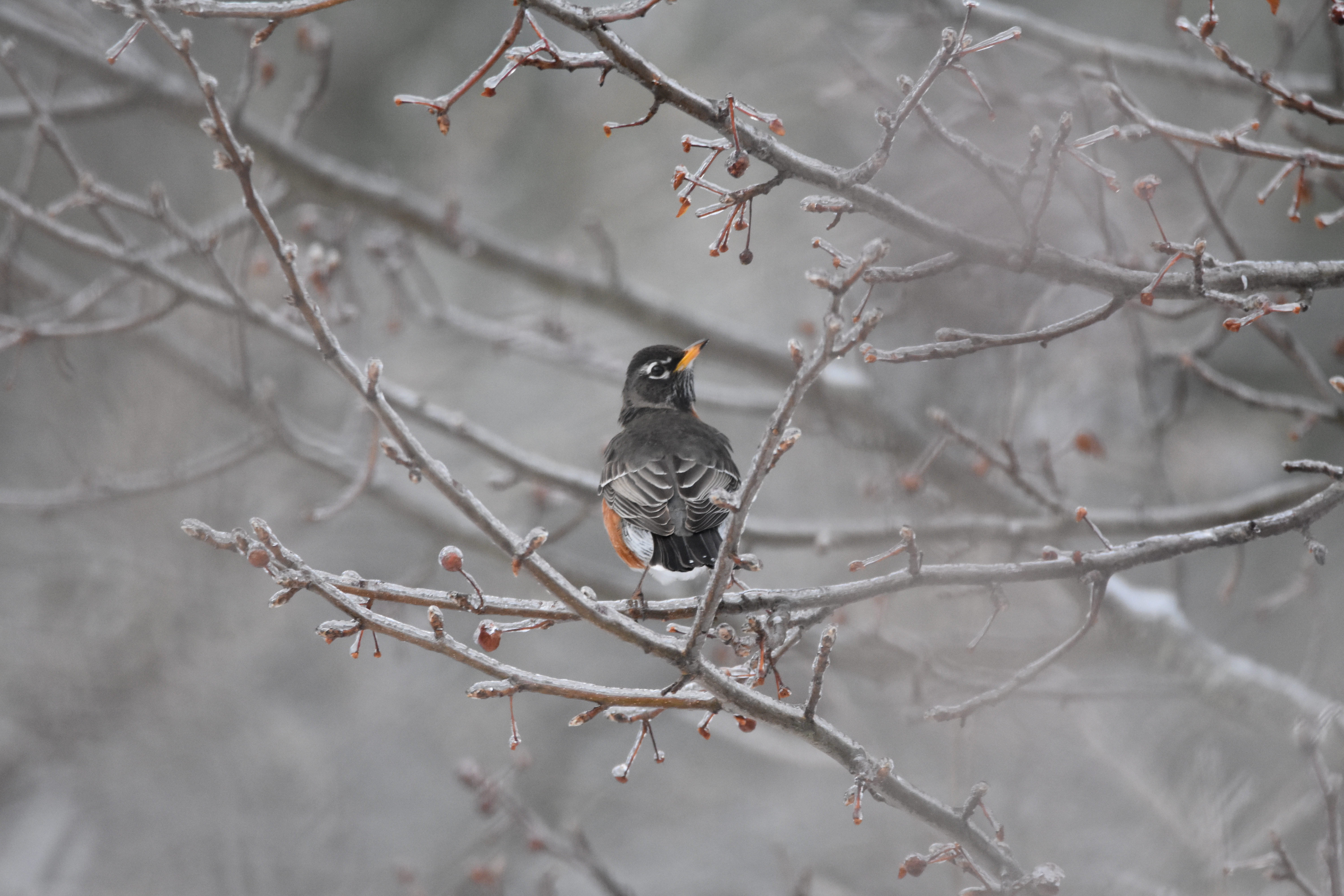 Yesterday morning I was trying to be productive and take advantage of a two-hour delay, but then I saw the ice outside, and the flocks of robins, and before I knew it, I was out the door and taking pictures...in my slippers!
