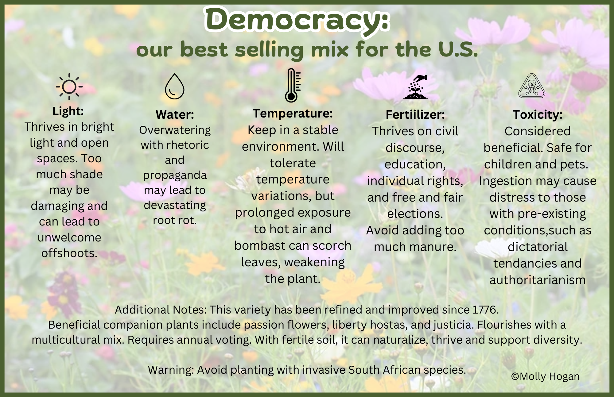 So, I looked up seed catalogues, got some ideas for the basic format, and started writing. I opted to focus on Democracy, something that appears to need some significant nurturing and grassroots support right now. First, I created a list of common categories (light, water, etc.), and then tried to figure out how to adapt them to my topic. I really enjoyed the mental exercise of trying to find the overlap between my topic and seeds within the form I’d chosen.