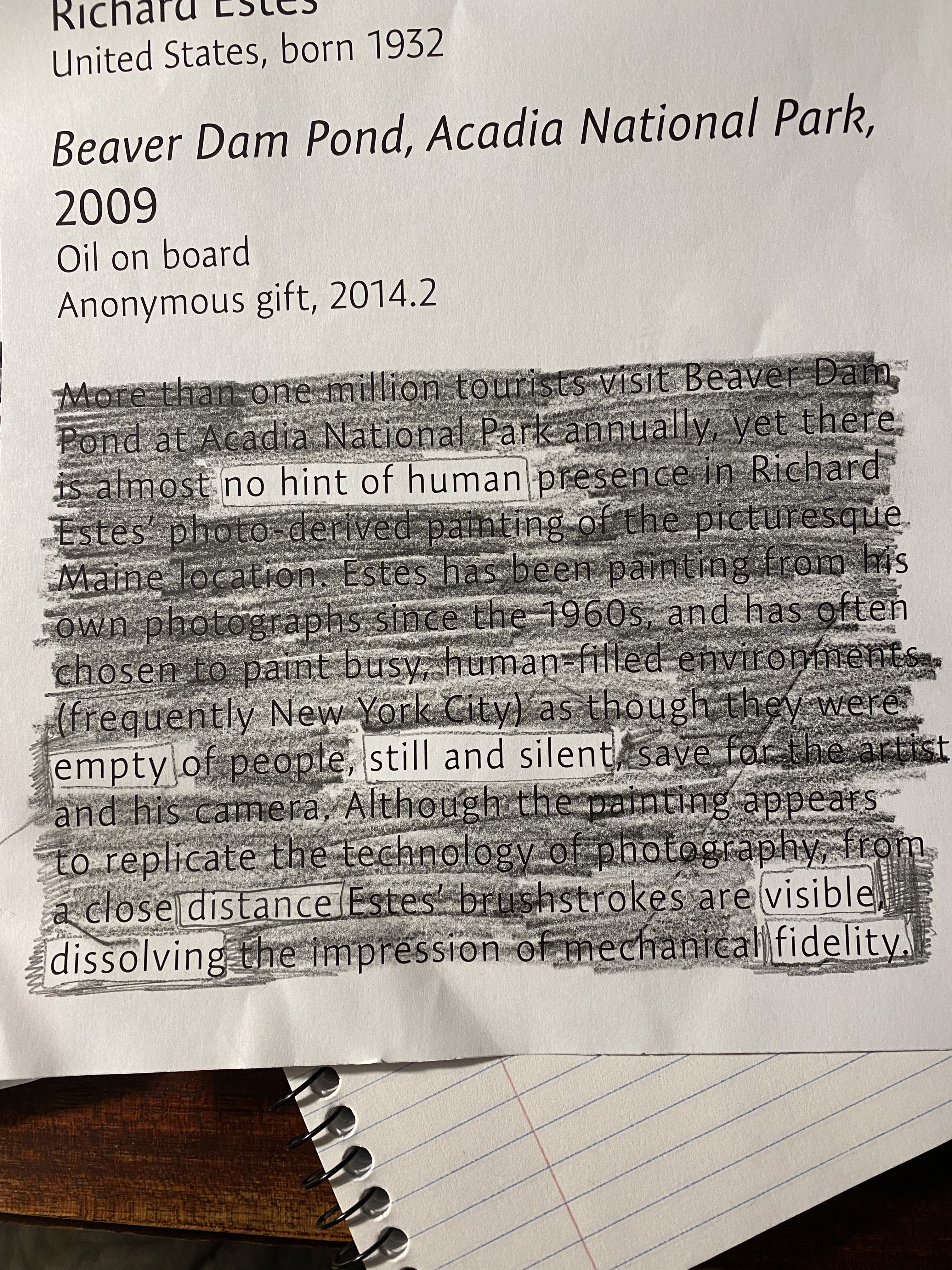 While Kurt wandered, Lydia and I decided to check out the erasure poetry center set up in the museum’s Great Hall. They had supplied printed pages and pencils. We reached through the crowded area to the materials, randomly selecting a page each, then settled in to create our poems. Here’s what I came up with: