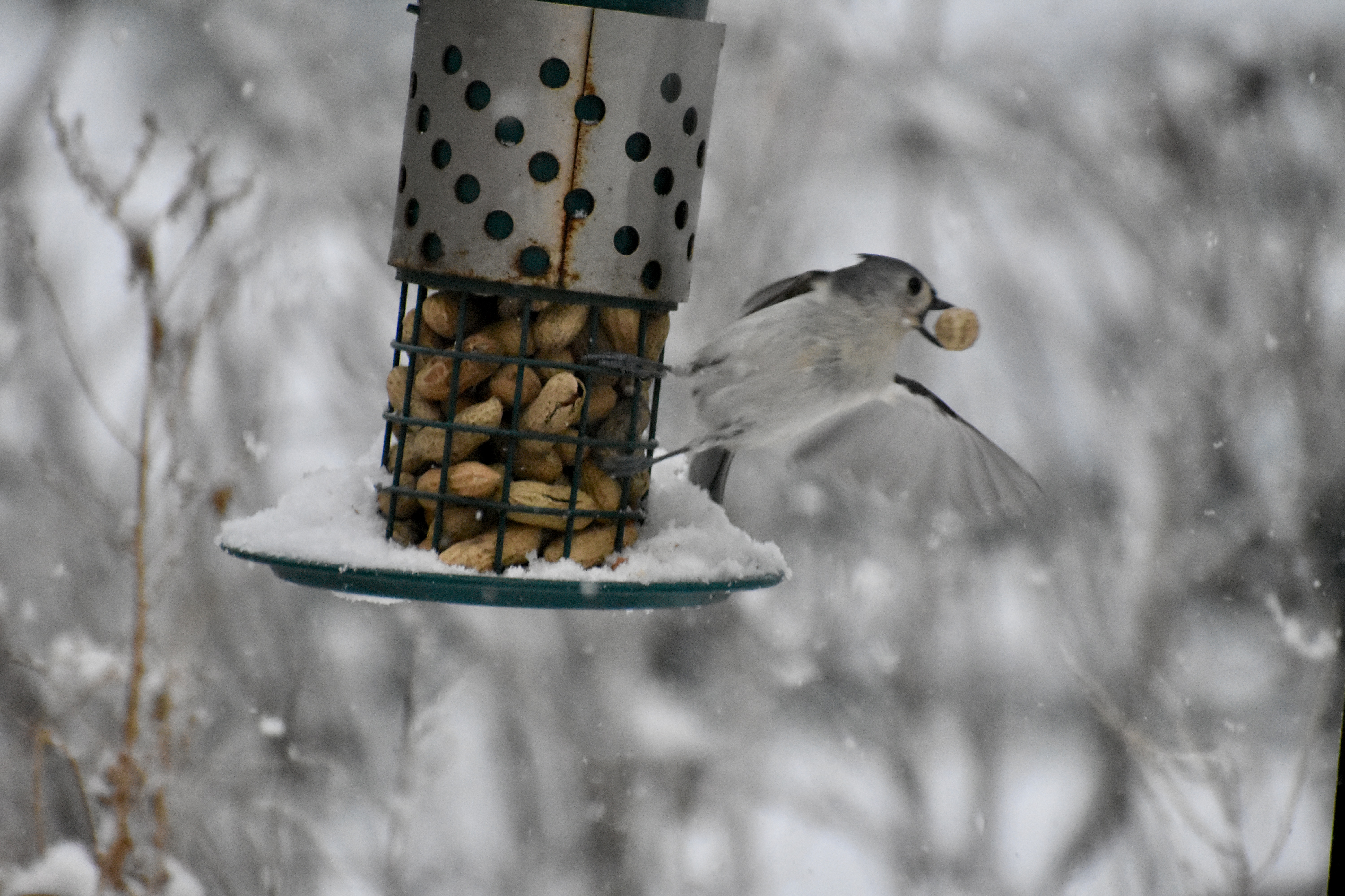 Finally, as the day lightened up a bit, I peeked out the window. Sitting on the platform feeder in the downpour was a tufted titmouse. This delighted me, as these are one of the birds I’ve been able to identify since childhood. Over the years, I’ve been mightily entertained by watching these small birds take oversized nuts and even peanuts from the feeders.