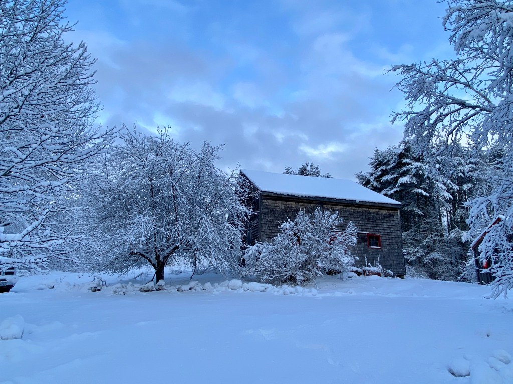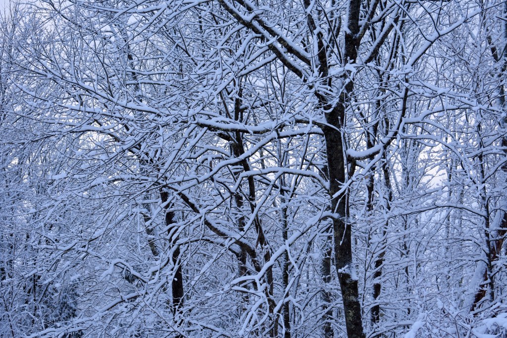 Everything was coated in thick blankets of white. The sky was quilted grey but, with the occasional thinning of clouds, it periodically shone opalescent. Winter-bare trees lifted branches limned with white, while pine boughs hung heavy yet somehow graceful with their snowy burden. Every so often a gust of wind lifted a branch or brushed two together, and a small powdery flurry shimmered and showered to the ground. It was mesmerizing.