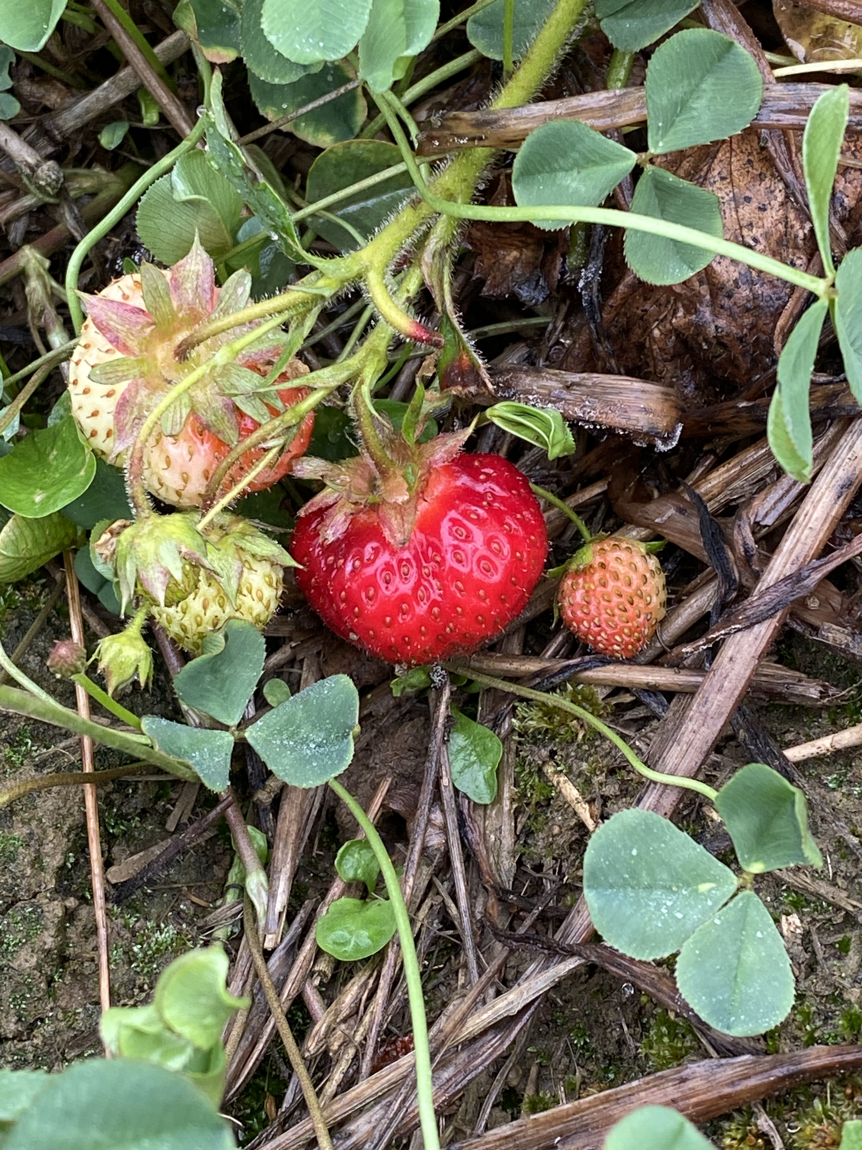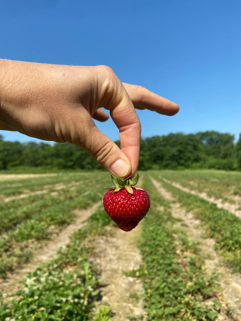 Picking strawberries tends to be a layered experience for me, and that morning was no exception. I crouched in my chosen row, avoiding puddles, searching for berries. A veery called repeatedly from nearby shrubs. Two cat birds swooped and dove nearby. As always, I listened to the voices drift over the fields from other pickers. Most people were in small groups or partnerships. I used to pick with my mother-in-law and children, but in recent years, due to distance and scheduling, I’ve been picking alone, steeped in memories.