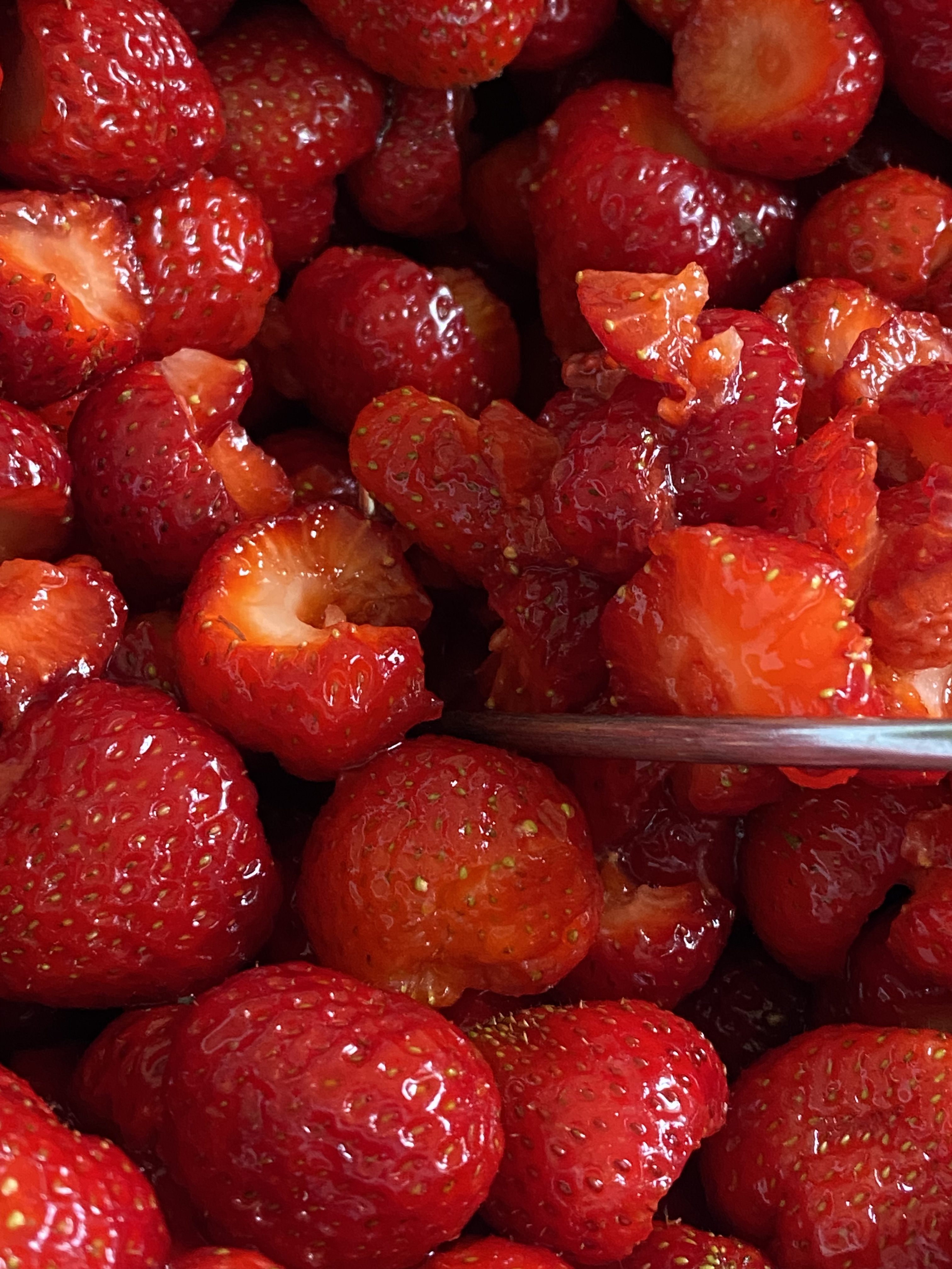 Walking out to the back yard to harvest rhubarb, I focused on the damp weight of the encroaching vegetation against my legs. I felt the gentle scrape of the massive leaves against my hands as I parted them and reached low into the plant. Heard the snip of scissors cutting through each ruby stalk and the subsequent tree fall of it timbering over. Back in the house, I focused on the flow of water over my hands as I washed each stalk. The crisp slice of the knife. The gathering pile of chopped pieces on the scarred cutting board. Then the hulling of each strawberry and the soft thunk as it landed atop the growing heap in the large, white bowl. The sticky red coating my fingers. The soft squishy sounds of mashing berries together, and the rush of juices. I savored the grit of sugar against my finger as I swept it across the top of the measuring cup. Watched it spill into the pot. Marveled at how the color transformed and intensified. Heard the steady thump of the spoon as I stirred, and the eventual gentle burble of a rolling boil. The heavy scent perfumed the kitchen.