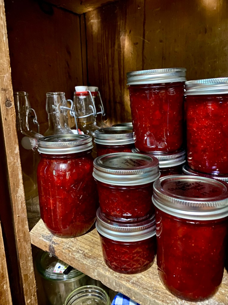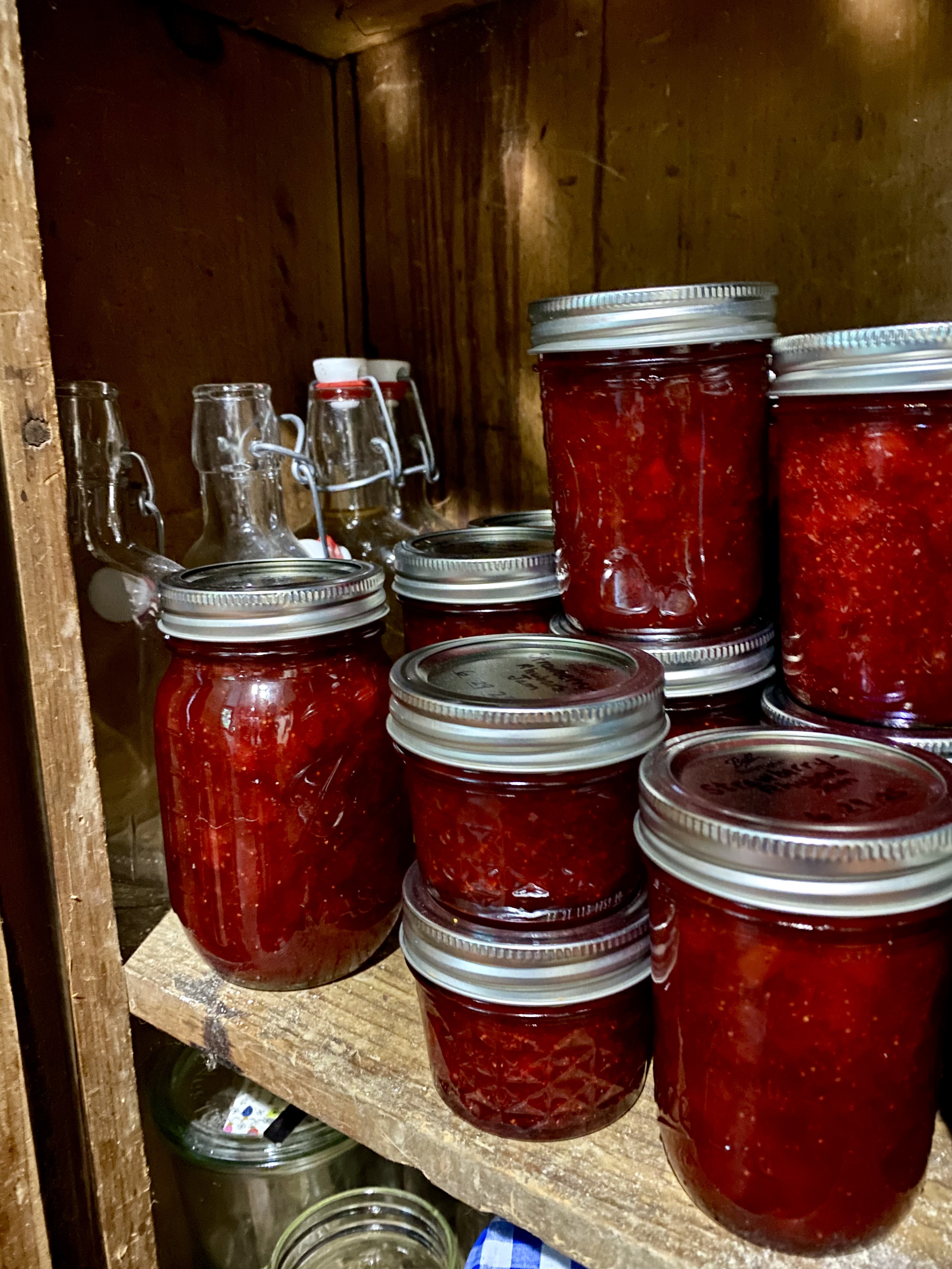 Later, as the day drew to a close, I stacked the jars of cooled jam in the wooden pantry. I admired the soft glow of berries through the quilted jars, and anticipated savoring their flavor on dark winter days.