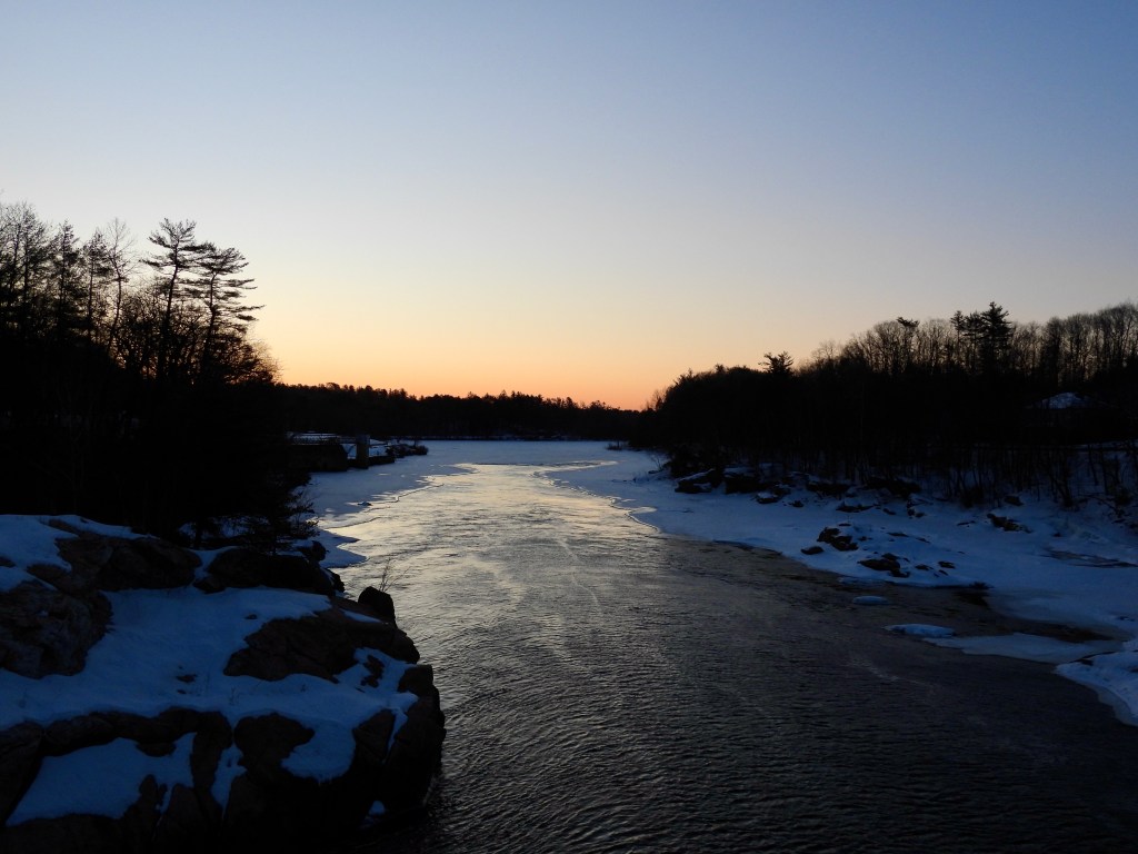 As it turns out, the morning was not particularly spectacular, unless you were talking about the wind and the cold, which were out in full force. Still, I parked by the river and walked out onto the bridge, getting buffeted by gusts of biting wind. Ice and snow covered much of the river below me. The sky lightened in the east with no dramatic prelude to dawn, just a steady color change. The wind shoved me again and again and sent scrolls of scrawling ripples down the river. By the falls upriver, the valiant small tree, rooted amidst the rocks, defiantly steadfast through all seasons and flood and drought, still stood fast. Way downstream, some sort of duck was busy dipping and diving into the water. A leaf scuttled across the bridge.